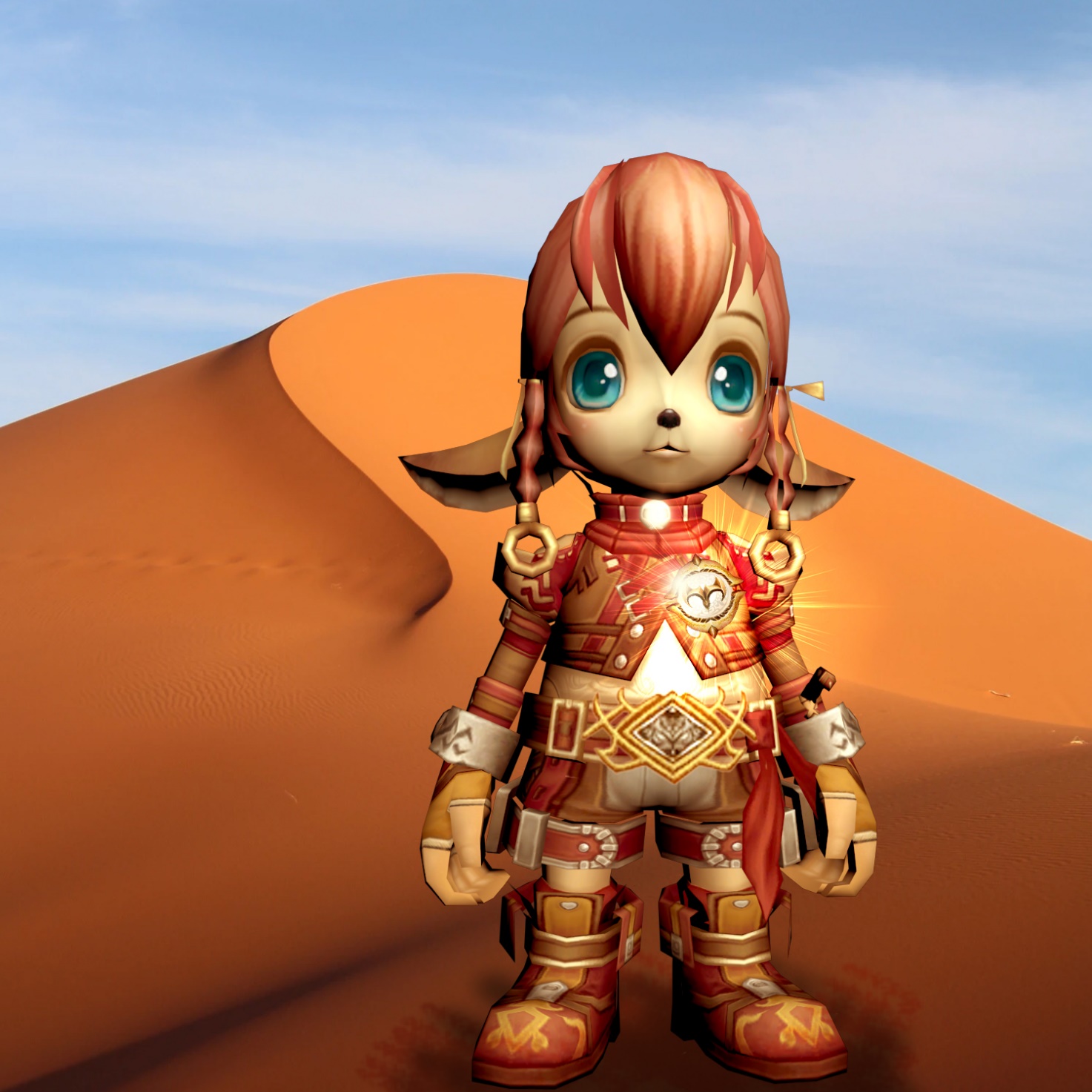 Охваченная страхом, Лейла схватилась за протянутую руку, не разбирая, кто перед ней. Единственное, что бросилось в глаза, это искрящийся свет, исходивший от одежды спасителя. Только когда незнакомец вытянул ее из зыбучих песков, кошечка смогла разглядеть спасителя. Перед ней сидел маленький мальчик с кроличьими ушами песчаного цвета. У него были розово-фиолетовые волосы и странная коричневая одежда. В этот момент никакого искрящегося света девочка не заметила. Странный малыш сидел на песке и, тяжело дыша, вытирал со лба пот.