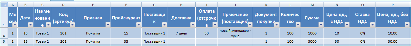 6. Столбцы «Поставщик», «Доставка», «Оплата (отсрочка), «Примечание (поставщик)», Документ покупки» – столбцы, характеризующие работу с поставщиком. Наименование поставщика, как все наименования, должно быть одинаковым во всех реестрах и отчетах. Остальные столбцы заполняются в произвольной форме и носят справочный характер.