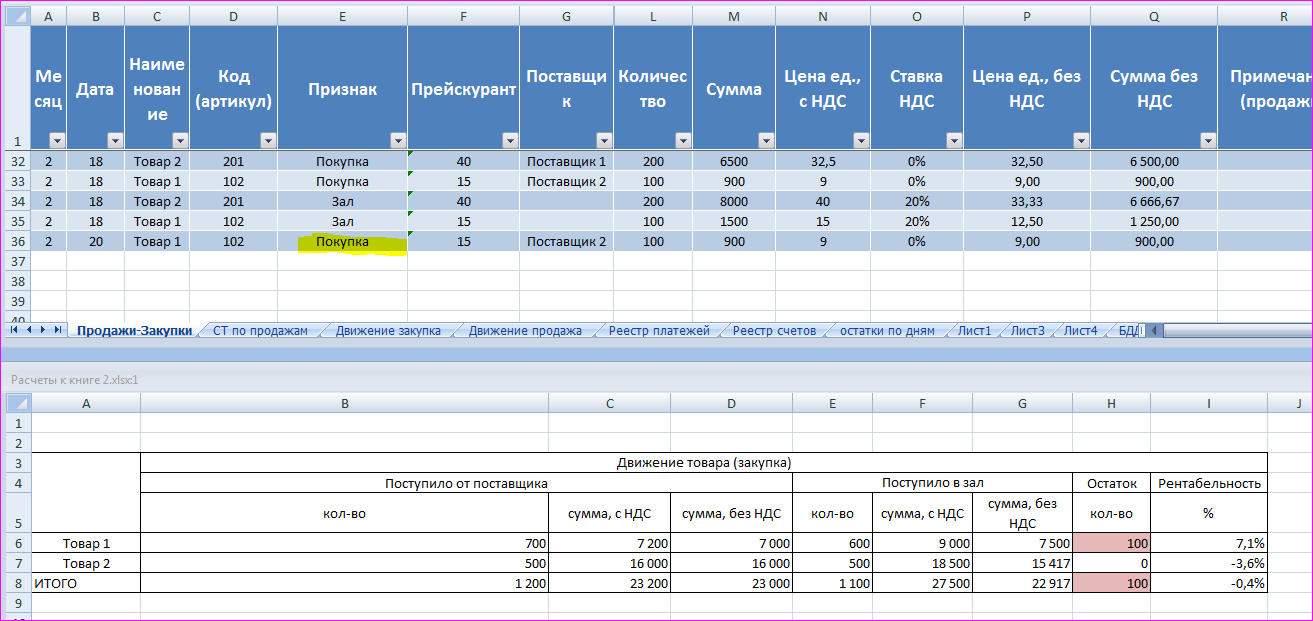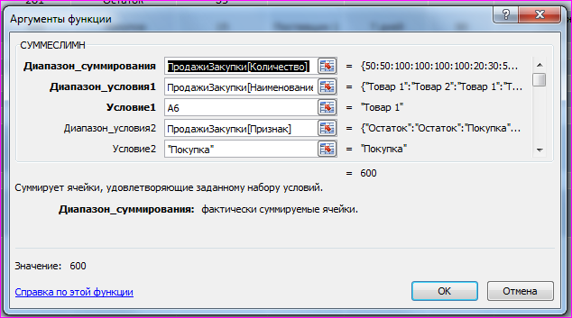 =СУММЕСЛИМН(ПродажиЗакупки[Количество];ПродажиЗакупки[Наименование];A6;ПродажиЗакупки[Признак];"Покупка")[2] – эта формула суммирует данные по количеству товара, приобретенного у поставщика.