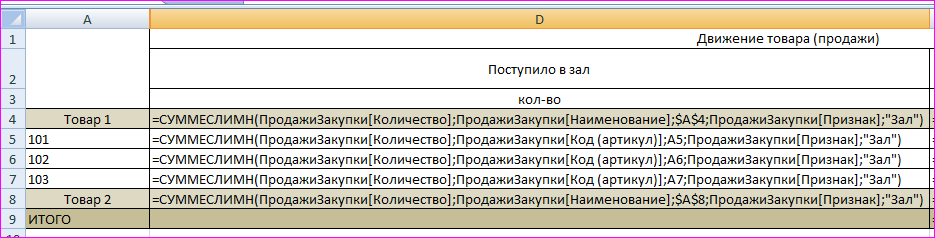 Из формулы видно, что из реестра «Продажи и закупки» выбираются и суммируются значения по группе признаков: количество, месяц, дата, признак, код (артикул)