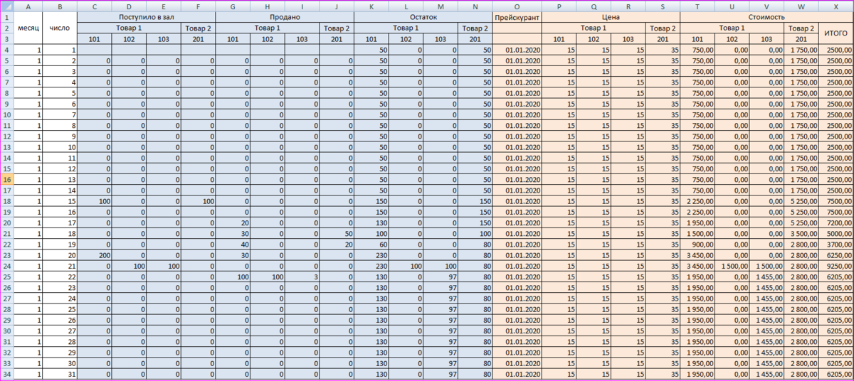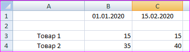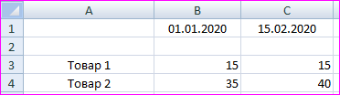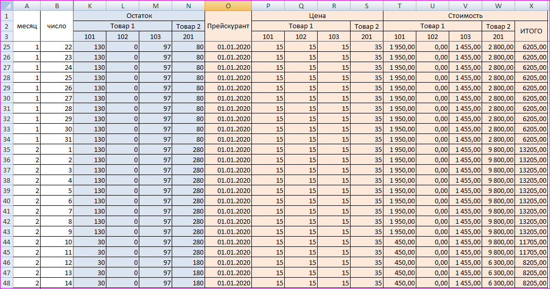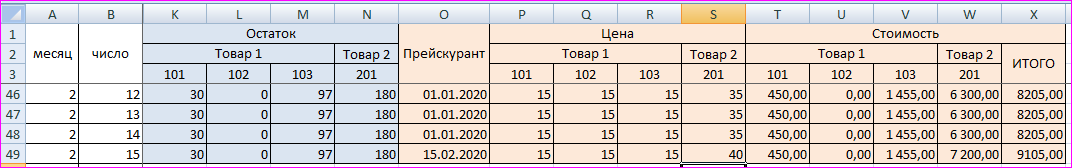 В таблице с ценами на листе «Прейскурант» изменение цен обязательно нужно отражать в новом столбце. Если просто поменять данные в столбце «В» на 01.01.2020, то все цены в отчете изменятся на новые, что приведет к ошибкам при расчете сумм товарных остатков за предыдущие периоды.