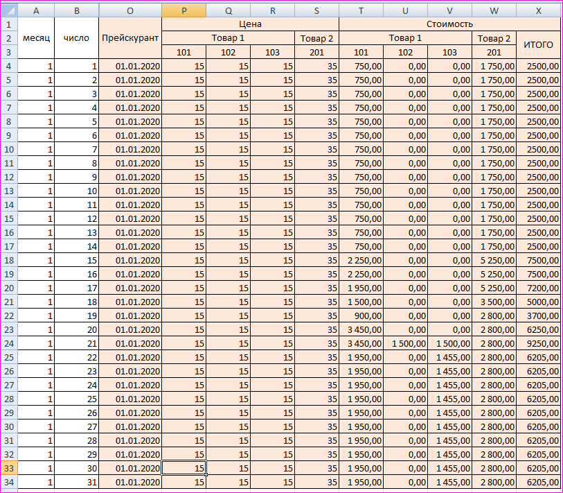 1. Месяц и дата (число месяца). Все параметры даты: число, месяц, год (в данном примере его нет) лучше заносить в разные столбцы, так легче работать с формулами и фильтрами.