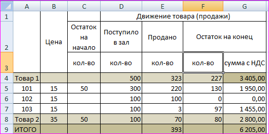 В нашем примере рассмотрен случай, когда весь товар хранится в зале, склада нет. При наличии склада в столбце «Признак» нужно будет указывать признак склада.