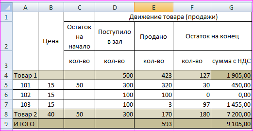 Если номенклатура небольшая, то в пределах действия одного прейскуранта цены в этот отчет «Остатки товара по дням» можно заносить как значения без формул. (Ведение таблицы с ценами на отдельном листе полезно не только для отчетов, но и позволяет анализировать динамику цен.)