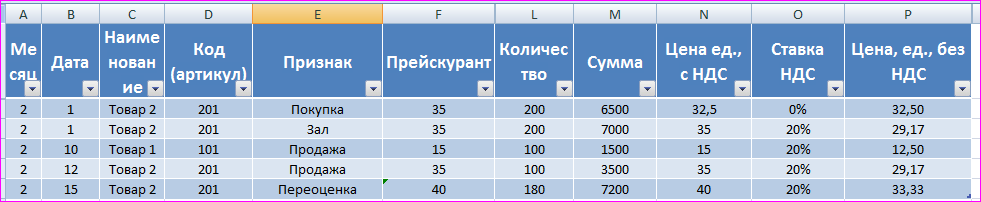 4. Столбец «Признак» – это признак, обозначающий движение товара, например: