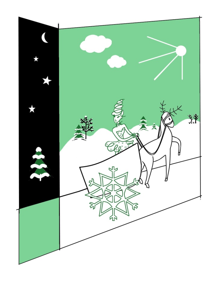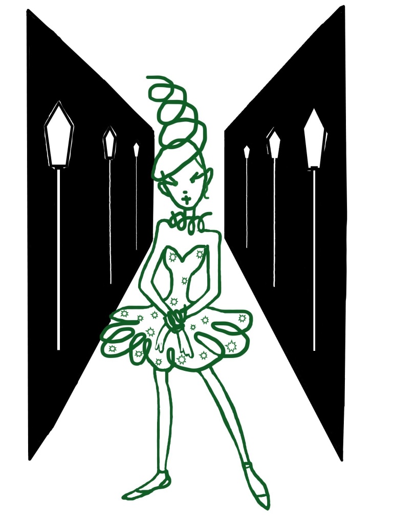 Внезапно с неба, стремительно вращаясь, спустилось что-то яркое и святящееся. Покружившись ещё несколько мгновений искристым серебряным волчком, «оно» остановилось перед ними и превратилось в миниатюрную балерину в пачке, похожей на сверкающие льдинки. Ресницы её, словно покрытые инеем, тоже поблёскивали в свете фонарей. Белые, будто запорошенные снегом волосы поднимались вверх пружинкой, которая при каждом её шаге то собиралась, то распутывалась.