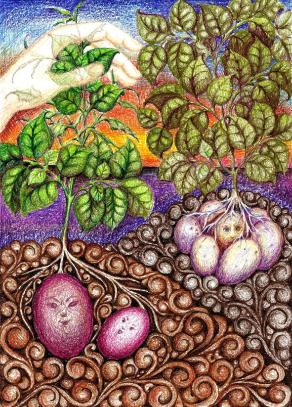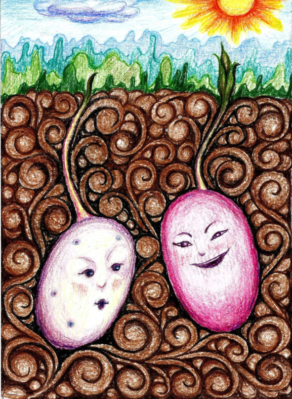 – А мне не страшно, я скорей хочу посмотреть, как там! – возразила её озорная соседка Розана, у этой картошки была розовая кожица. – Там, говорят, яркое солнце и тёплые дожди, звонкоголосые птицы и удивительные порхающие насекомые!