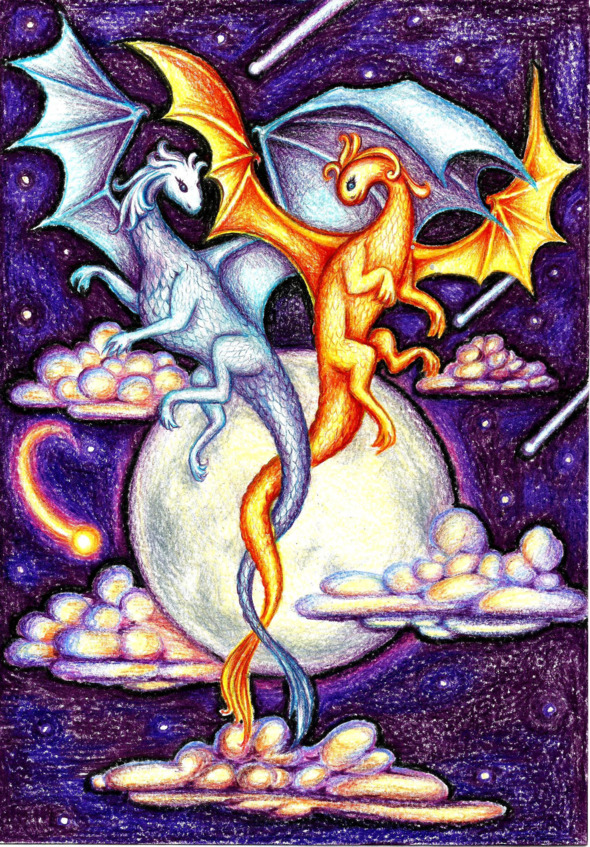 Однажды тёмной звёздной ночью, на берегу реки встретились два удивительно красивых дракона! Один был как лунный свет серебряным, а другой как солнце золотой. Они увидели друг друга, их чешуйки драконьей кожи переливались при лунном свете, создавая волшебное сияние. Они всю ночь летали и играли друг с другом, радуясь встрече. Ведь каждый из них думал, что он один такой и нет ни одной живой души похожего на него.