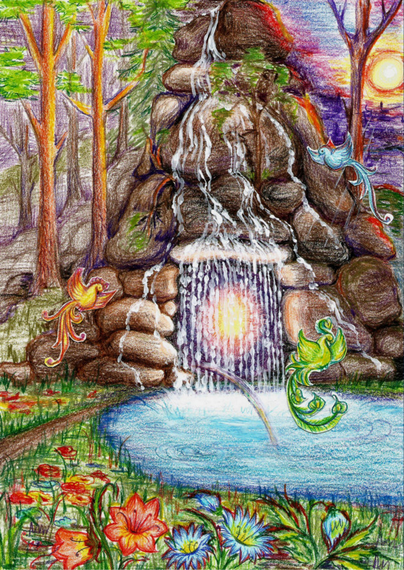 Хрустальные струи воды сбегали с вершины горы. Они то ударялись о каменные валуны, камни, камешки, разбиваясь вдребезги – в брызги и в капли, а то растекались по каменистым отвесам и падали тонкими нитями, создавая таинственную завесу. Прозрачные быстрые ручейки стекали сквозь пещерки и ущелья, попадая в маленькое лазурное озеро у подножия горы. Под лучами яркого солнца над озером стояла разноцветная радуга. По берегам водопада росли вековые дубы, высились вечнозелёные сосны и кедры. Ветви плакучей ивы свисали до самой глади воды голубого озера. Около озера раскинулась лужайка с изумрудной мягкой травой и невероятно красивыми цветами. Везде порхали дивной красоты птицы, их щебетание перекликалось с шумом падающей воды. Изящество нетронутой красоты и величественность природы изумили Злату и Серебрика.