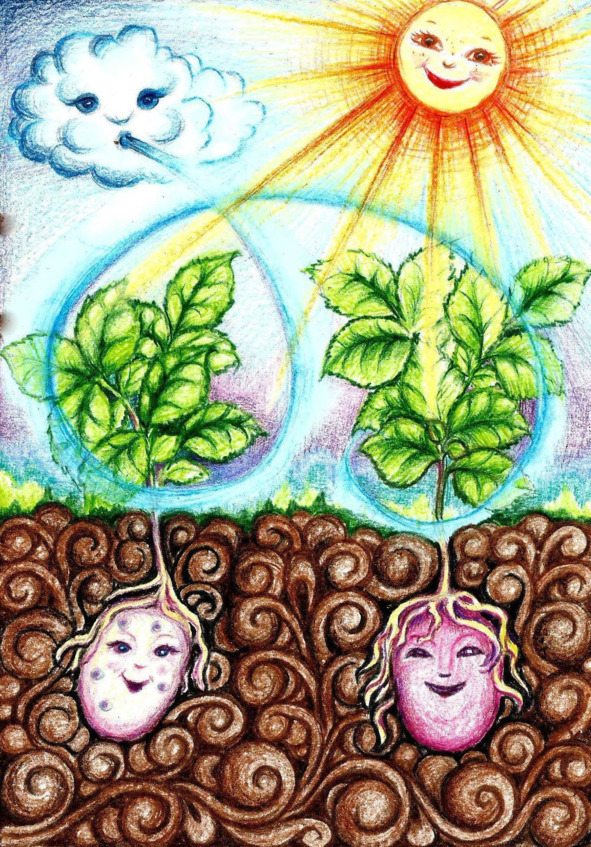И вот на поверхности земли показались первые листочки. Они раскрывали нежно-зелёные ладошки солнышку, а солнце в ответ нежно их гладило своими лучами. Прилетал шалун-ветерок, здоровался с ними, лаская листочки трепетным дуновением. Ветерок приводил с собой тучку, а тучка обильно поливала их дождём, умывая каждый молодой росточек. И наши два молодых картофельных кустика были обласканы небесными няньками. Птицы пели им песни, и даже соловушка вечерней порой радовал их своими трелями, всё вокруг покрылось дивными цветами, и благоуханный аромат окутывал нежные ростки.
