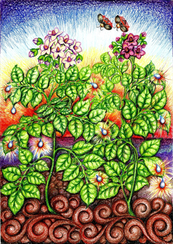 Так росли они, набираясь сил, и вот уже превратились в пышные картофельные кустики, с толстым стеблем и сочными зелёными листьями. И цветочки вот-вот должны были уже распуститься на верхушках их стебельков. Они были молоды, свежи и прекрасны.