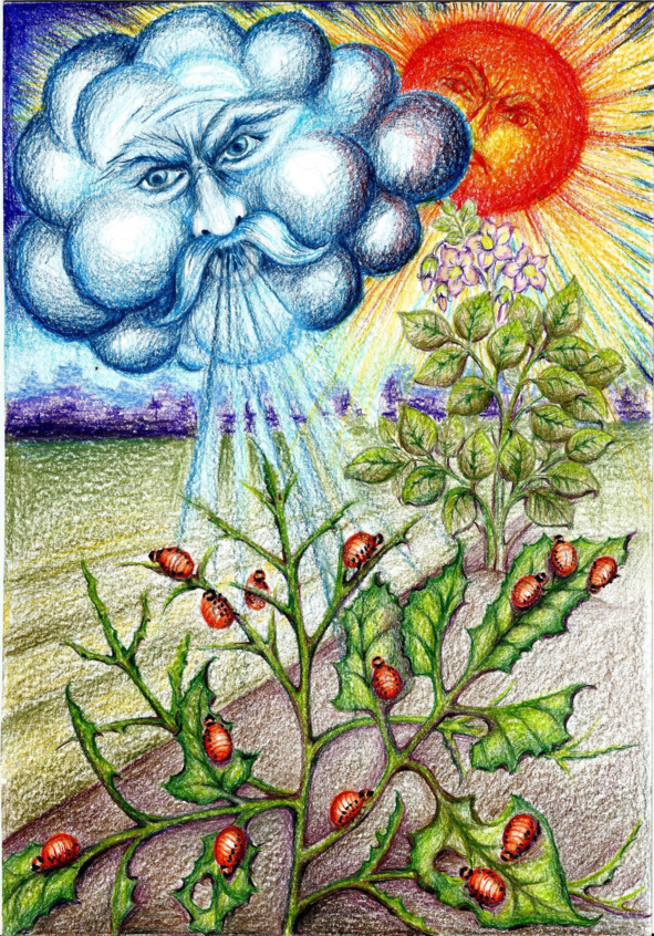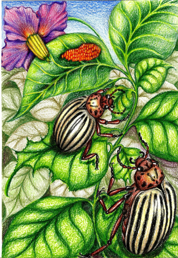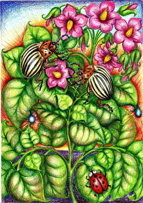 Однажды ранним утром, когда солнышко своими первыми лучами ещё только разгоняло ночную тень и заливало ало-золотистым светом деревья и поля, на картофельном поле появились два полосатых жука. Это были жук и жучиха, они летели и тихо переговаривались и, ехидно хихикая, обсуждали, какие здесь сочные листья, и как они здесь хорошо заживут, и сколько еды для их будущих деток. Они добрались до края поля и уселись на лист боязливого картофельного куста. Синеглазка ещё нежилась в ласковых лучах зари и наслаждалась утренней прохладой и сверкающими росинками на листьях.