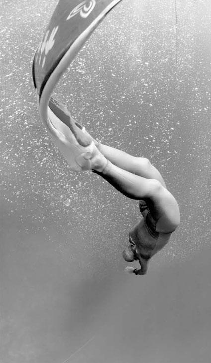 При отрицательной плавучести вес вытесненной телом воды меньше веса тела. Тогда фридайвер погружается. С увеличением глубины все меньше и меньше вытесняет фридайвер воду, поскольку легкие его сжимаются, и потому падает в бездну все быстрее и быстрее.
