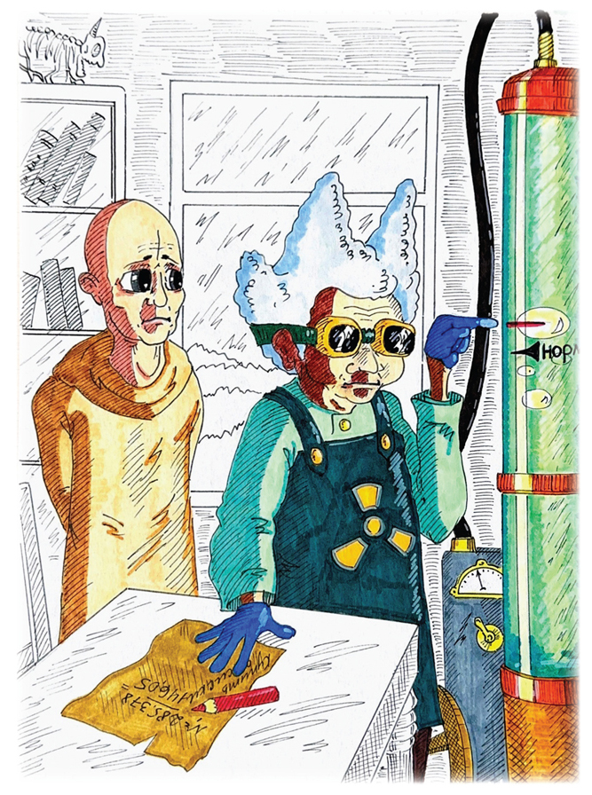 Старик открыл дверь лаборатории, и они вошли в темный зал, заставленный приборами, колесами, трубками. Что-то булькало, что-то пыхтело… Двигаясь в полумраке, словно две мыши между нагромождением оборудования, они наконец подошли к большой стеклянной колбе, наполненной светящейся жидкостью. На дне колбы медленно шевелился странный осадок. Возможно даже, это был крот, случайно свалившийся в аппарат. На уровне глаз в жидкости висел пузырь воздуха. Он был неподвижен. Склянка замер перед колбой в молчании.