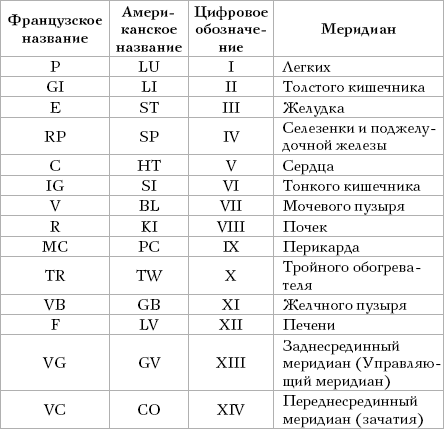 В китайской медицине меридианы – это функциональная неразрывная часть органа, а потому каждый меридиан имеет название соответствующего органа. Сейчас добавлен и международный индекс (первая буква французского названия органа): меридиан легких – Р, меридиан толстой кишки – GI, меридиан желудка – Е, меридиан селезенки и поджелудочной железы – RP, меридиан сердца – С, меридиан тонкой кишки – IG, меридиан мочевого пузыря – V, меридиан почек – R, меридиан перикарда – МС, меридиан трех обогревателей – TR, меридиан желчного пузыря – VB, меридиан печени – F (см. рис. 2–15).