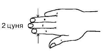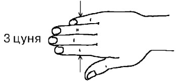Один цунь также равен поперечному размеру ногтевой фаланги большого пальца. Соответственно поперечный размер ногтевых фаланг II и III пальцев равен 1,5 цуням; II, III и IV пальцев – 2 цуням, всех четырех пальцев (II, III, IV и V) – 3 цуням. Эти пропорциональные отрезки – цуни – применяются для нахождения точек как в вертикальном, так и в горизонтальном направлениях (рис. 1).