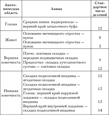 В основе этого метода лежит принцип деления вертикального размера определенных областей тела на стандартное для каждой области число делений.
