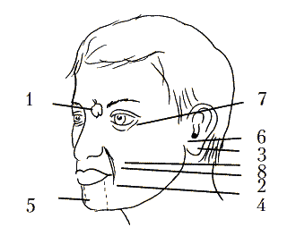 Рис. 1. Диагностика по лицу: 1 – зона сердца; 2 – носогубная складка отражает состояние сердца и желудка; 3 – сморщенная мочка уха – признак предрасположенности к инфаркту миокарда; 4 – удлинение носогубной складки говорит о слишком большой нагрузке на сердце; 5 – зона онемения между подбородком и нижней губой указывает на возможность развития инфаркта миокарда; 6 – узелки на мочке уха – перегрузка левого желудочка; 7 – отечность нижних век с восковым оттенком предупреждает о сердечной или почечной недостаточности; 8 – дополнительные складки на носогубной складке отражают патологию сердца и желудка, а также врожденные дефекты сердца, либо перенесенную в детстве дифтерию
