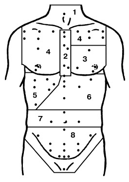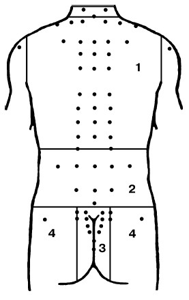 Точки, расположенные на передней поверхности тела, отыскиваются при проведении условно ряда вертикальных и горизонтальных линий. В местах их пересечения и находятся точки, необходимые для приставления пиявок. Это всего 7 вертикальных линий, по 3 боковых от переднесрединной линии тела, образующих меридианы тела (рис. 17). Зоны, расположенные на задней поверхности тела, соответствуют отделам позвоночного столба (рис. 18). Точки, расположенные на задней поверхности тела, находятся на пересечении вертикальных линий, проходящих параллельно заднесрединной линии, их по две с каждой стороны, а горизонтальные линии проходят по межпозвоночным промежуткам соседних позвонков. На голове точки отыскиваются при пальпации, ориентируясь на их болезненность, в частности, на лице они часто соответствуют местам выхода веточек тройничного нерва и сосудов.