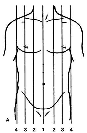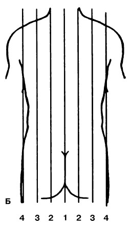 А: 1– линия; 2 – 1-я боковая линия; 3 – среднеключичная линия (2-я боковая); 4 – 3-я боковая линия; Б: 1 – заднесрединная линия; 2 – паравертебральная линия (1-я боковая); 3 – 2-я боковая линия; 4 – 3-я боковая линия