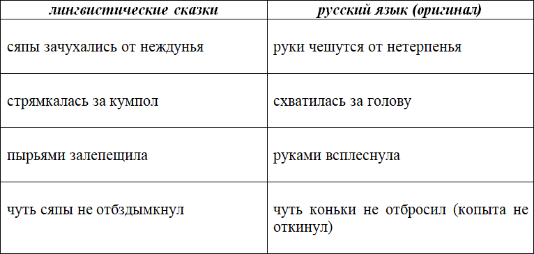 Второй критерий успешности эксперимента – зарождение фразеологии. Да, эти выражения во многом калька с существующих в русском языке, но это и есть один из способов возникновения фразеологизмов. На данный момент в тридцати сказках этой книги можно насчитать всего несколько словосочетаний, могущих претендовать на статус устойчивых сочетаний и фразеологизмов. Они приведены в таблице.