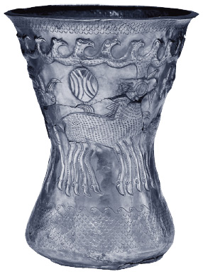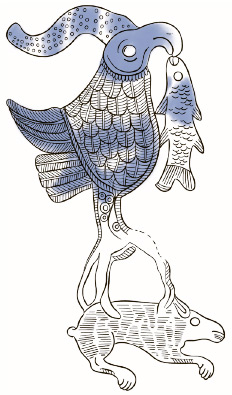 Изображение на фракийском кубке: хищная птица с зайцем в когтях и рыбой в клюве. IV в. до н. э.
