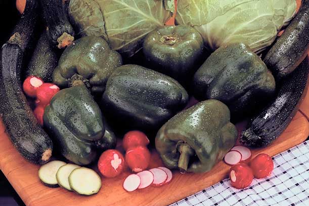 На дно салатницы помещают листья салата, затем сверху выкладывают в форме цветка тонкие кружки помидора, украшают веточками петрушки, перьями лука, накрывают слой редисом, огурцами, сладким перцем, чередуя с зеленью. Дольки помидора укладывают на оставшуюся часть салатницы, перекладывая их зеленым луком и сладким перцем.