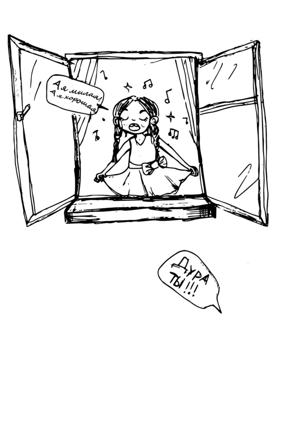 А в это время мимо окна шёл соседский мальчик Васька. Увидел он Марусю в окне, залюбовался ее красотой, заслушался ее песней. Вот, думает, девочка с высокой самооценкой, ничего себе! Но показать своё восхищение Васька никак не мог, дабы не испортить достойную репутацию уличного хулигана. Иначе кранты, будут дразнить женихом или ещё какими-нибудь обидными для семилетнего мужчины словами.
