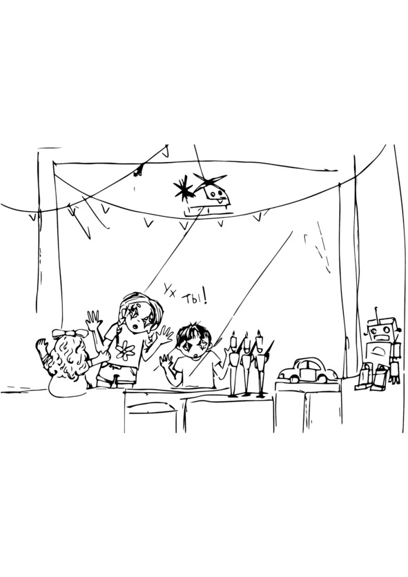 «Деник, кажется, мы как-то долго гуляем. Кажется, наша мама может за нас переживать начать, или вообще подумает, что мы потерялись. И, наверное, уже твою курицу в кафе принесли. Пойдём-ка, Деник, обратно!» – говорит мудрая Маруся.