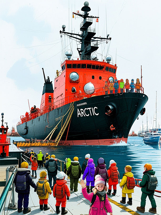 The captain gave the order, and the children, carrying their backpacks, began boarding the nuclear icebreaker. It was a true marvel of technology – a vessel capable of breaking through many feet of ice at sea so other ships carrying supplies for the people of the North could follow. The icebreaker is powered by a nuclear reactor, which allows it to travel huge distances without refueling.