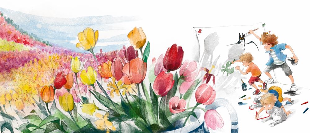Наши мальчики как раз и жили в таком городе, маленьком-маленьком. Мама называла его деревней. Тут тоже были каналы, велосипеды и целые поля цветов. Цветы – ещё одно волшебство Голландии. Конечно, цветы есть и в твоей стране, и даже в твоём городе. Просто в Голландии их та-а-ак много, что иногда невозможно отвести взгляд от полей, проплывающих в окнах машины, которую ведёт папа.