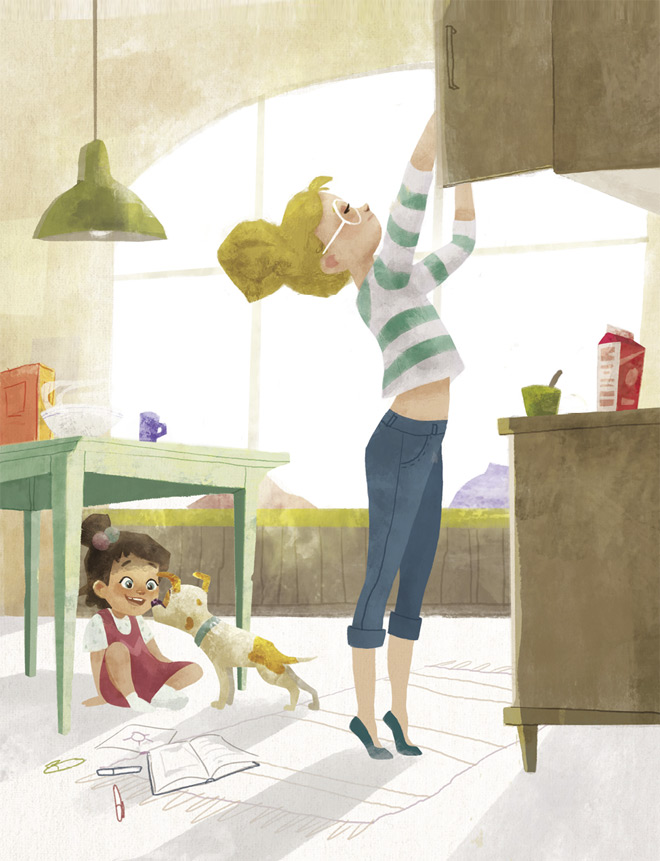 – Мама, пей скорее, все давно на площадке! – просит Мира, спрыгивая с подоконника, и садится за стол. Она торопливо ест кашу и посматривает в окно.