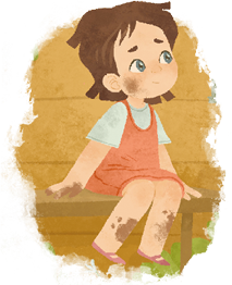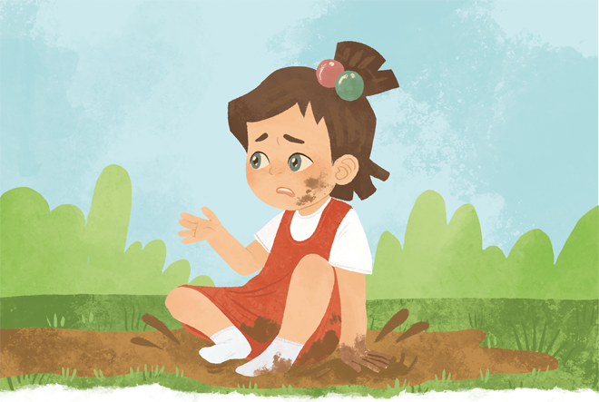 Когда Мира и Гоша выбежали за ней на улицу, сестрёнка уже спустилась по ступенькам и зашла в большую лужу. Вода быстро заполнила тапки и тёмными разводами поднялась по штанам. Бейби казалась невероятно довольной. Она разглядывала лужу, бултыхала ногой и вдруг, не удержавшись, уселась прямо в грязь.