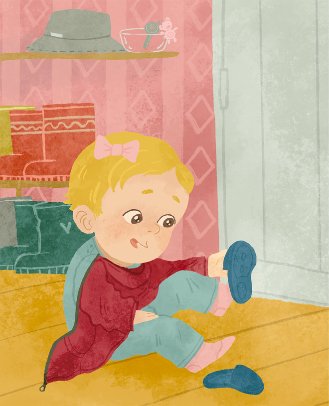 Пока Мира наблюдала за мухой, попавшей в паутину, а Гоша отбирал у Сони свой любимый карандаш, который собака нашла на полу и решила сгрызть, Бейби направилась к входной двери. Здесь неровными рядами стояли ботинки и резиновые сапоги. Бейби плюхнулась на пол и стала натягивать свою правую уличную тапку на левую ногу. Последнее время она всё хотела делать сама и отказывалась от любой помощи с одеждой, обувью или едой.