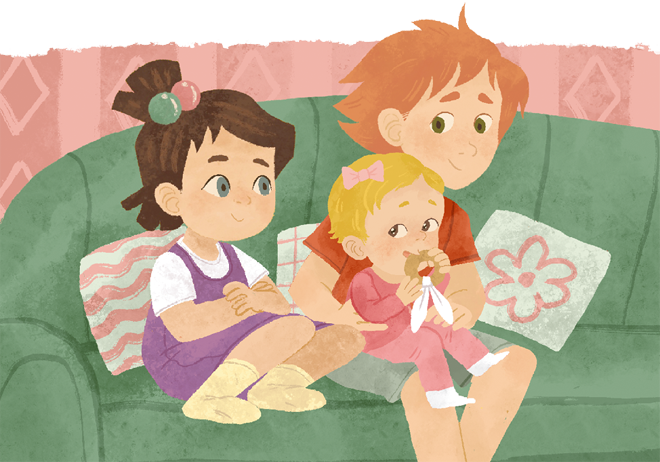Сначала дети помыли Бейби, потом по очереди искупались сами. Переодевшись, Мира и Гоша с Бейби на руках уселись на диван, довольные собой.