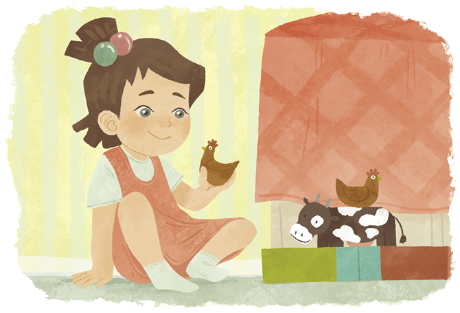 Пока мама и Бейби обнимались в кровати, Мира принесла две коробки с разноцветными пластмассовыми брусками и с деревянными кубиками, три машинки и фигурки домашних животных. Она быстро построила квадратный забор, поместила в загон свинью, корову, телёнка с коричневым пятном, двух куриц, утку и плотно закрыла калитку. Затем соорудила гараж, поставила в него машины и накрыла их крышей.