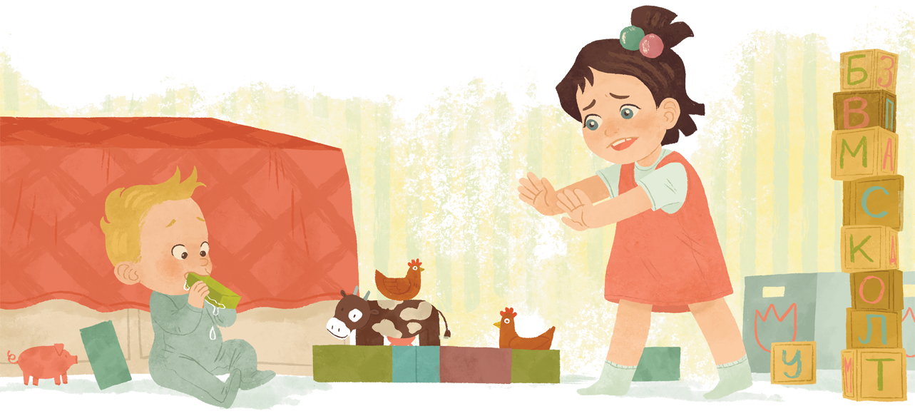 От крика сестры малышка замерла, а потом заметила лежащий рядом пластмассовый брусок, схватила его двумя руками и засунула в рот.