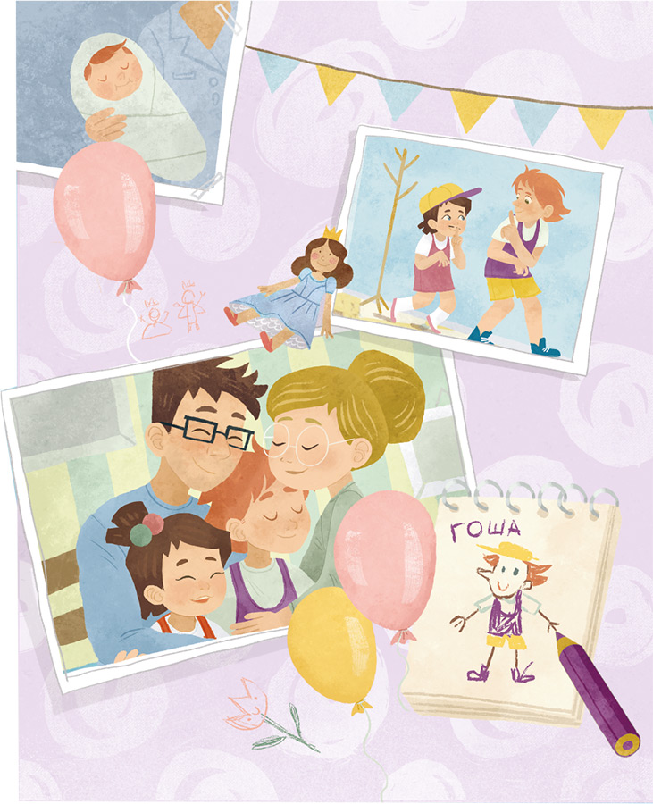 – Привет, я Мира. Мне шесть лет. А это моя семья: папа, мама, брат Гоша и сестрёнка Бейби. Ещё у меня есть собака Соня, две бабушки, один дедушка и лучшая подруга Ева. Я люблю кататься на самокате (если честно, даже дома), прыгать на батуте, играть в футбол и есть блинчики по субботам. Чаще всего я встречаюсь с друзьями на площадке перед домом, но иногда они приходят ко мне в гости. Я задаю много вопросов, и родители помогают мне находить на них ответы.