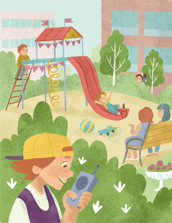 Брат и сестра уже полчаса играли в шпионов. Две рации Гоше подарили ещё на прошлый день рождения, но он долго не мог придумать, где же ими воспользоваться. Конечно, лучше всего переговариваться по рациям в лесу, но папа упорно отказывался ехать за город. После прошлой поездки, когда ребята заблудились, папа каждый раз придумывал новую причину, почему сейчас нельзя отправиться в лес. Но Гоша прекрасно понимал, что папа просто волнуется. И тогда он решил, что в шпионов можно играть и на детской площадке.