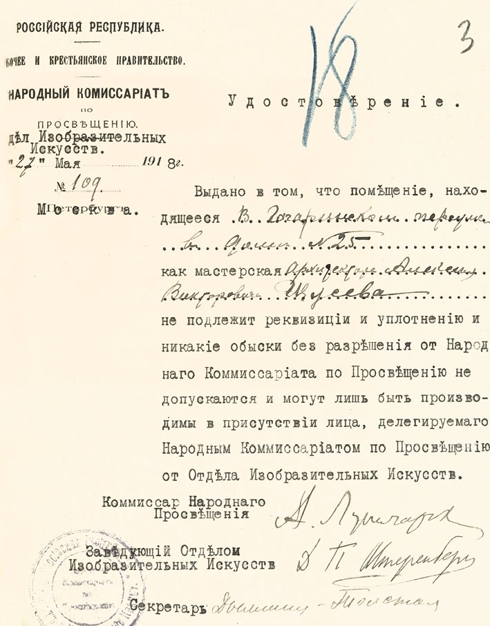Удостоверение, выданное А. В. Щусеву и закрепляющее за ним дом № 25 в Гагаринском переулке как творческую мастерскую