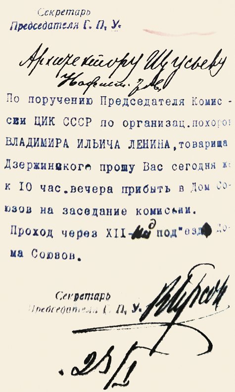 – Про вещи ничего не сказано. Просят в Дом союзов. Вот. – И он протянул бумагу: «Секретарь Председателя Г.П.У. Архитектору Щусьеву. Уважаемый тов. По поручению Председателя Комиссии ЦИК СССР по организац. похорон ВЛАДИМИРА ИЛЬИЧА ЛЕНИНА, товарища Дзержинского, прошу Вас сегодня же к 10 час. вечера прибыть в Дом Союзов на заседание комиссии. Проход через XII-ый под" езд Дома Союзов. 23/I». Подпись неразборчивая, что-то типа «Впрсон».