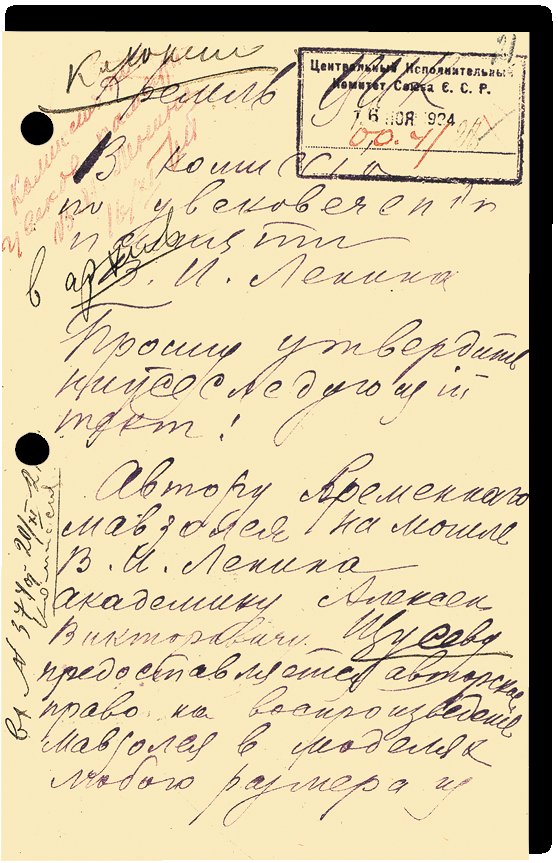 Записка А. В. Щусева с требованием утвердить за ним право на воспроизведение Мавзолея в моделях любого размера