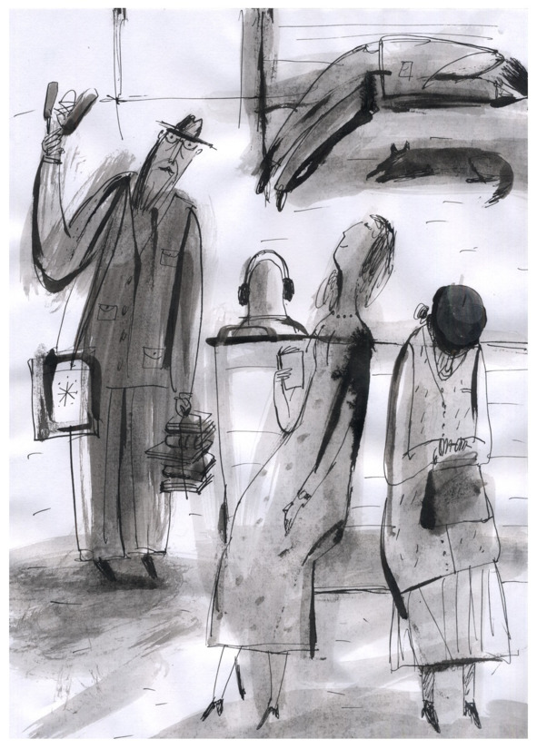 Солнечное утро, в вагоне царит добродушная атмосфера, народу не много, кругом улыбки и негромкие разговоры. Вдруг дверь из тамбура резко открывается, входит лоточник со скорбным выражением лица и замогильным голосом произносит: