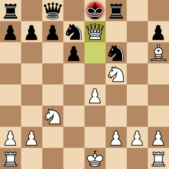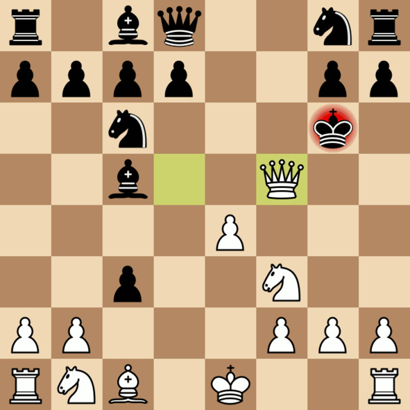 1. e4 e52. d4 ed3. Bc4 Nc64. Nf3 Nf65. Ng5 d56. exd5 Nd57. O-O Ne58. Re1 f69. Nf3 Qd610. Nxe5 fe11. Qh5+ Kd812. Bxd5 Qd513. Rxe5 Qd614. Qe8#