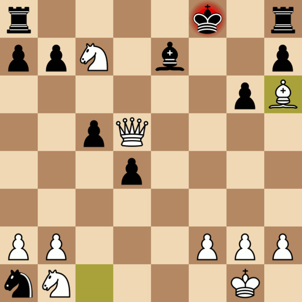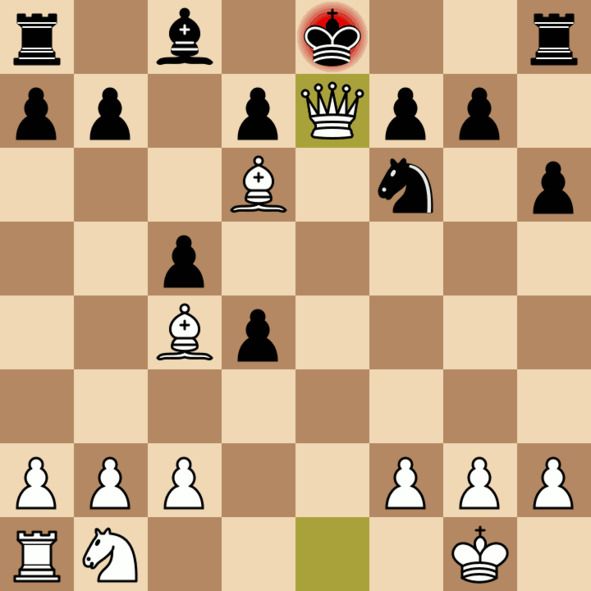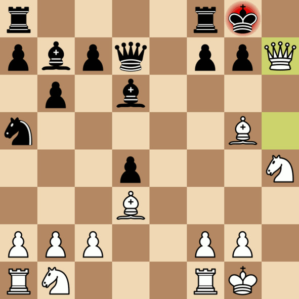 1. e4 e52. d4 Bd63. dxe5 Be54. Nf3 Nc65. Nxe5 Ne56. Nc3 Nf67. f4 Nc68. e5 Ng89. Be3 b610. Qg4 g611. O-O-O Bb712. Qh3 Qe713. Nd5 Qd814. Bb5 Nge715. Nf6+ Kf816. Qh6#