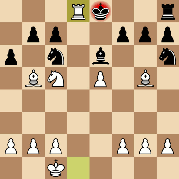 1. e4 e52. d4 ed3. Bc4 Nf64. Nf3 Ne45. Qxd4 Qe76. O-O Nc67. Qd1 g68. Re1 Bg79. Bg5 Qf810. Rxe4+ Ne711. Rxe7+ Kd812. Rxd7+Ke813. Rd8#