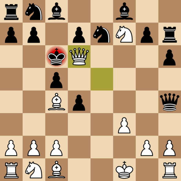 1. e4 e52. d4 ed3. Bc4 c54. Nf3 h65. Ne5 Qe76. Nxf7 Qe47. Kf1 Rh78. f3 Qh49. Qe2+ Ne710. Nd6+ Kd811. Nf7+ Kc712. Qe5+ Kc613. Qd6#