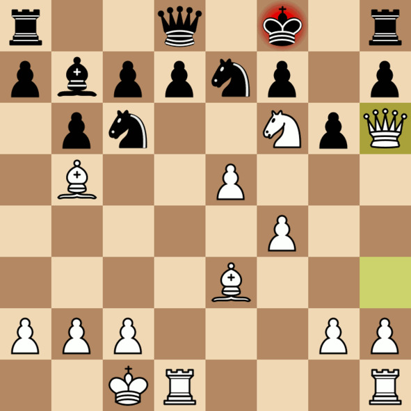 1. e4 e52. d4 ed3. Bc4 d64. c3 dc5. Nxc3 Be76. Qb3 Be67. Bxe6 fe8. Nf3 Nf69. Ng5 Nbd710. Nxe6 Qc811. Nxg7+ Kpf812. Bh6 Rg813. Nf5+ Ke814, Qe6 Rf815. Qxe7#