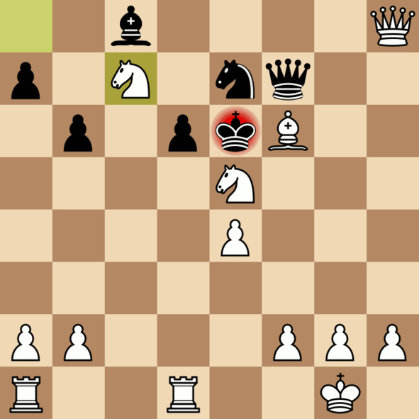 1. e4 e52. d4 ed3. Bc4 Nc64. Nf3 h65. 0—0 Bc56. c3 dc7. Bxf7+ Kf78. Qd5+ Kf89. Qxc5+ Ke810. Nxc3 d611. Qh5+ Kd712. Qg4+ Ke713. Qxg7+Ke814. Nd5 Qd715. Qxh8 Qf716. Nxc7+ Kf817. Bxh6+ Ke718. Bg5+ Kd719. Nxa8 b620. Rfd1 Nf621. Bxf6 Ne722. Ne5+ Ke623. Nc7#