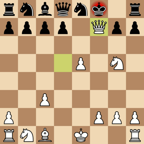1. e4 e52. d4 ed3. Bc4 Qh44. Qxd4 Nf65. Nc3 Nc66. Qe3 Bb47. Nf3 Qe48. Bxf7+ Kf79. Ng5+ Kg610. Nxe4 d511. Nxf6 gf12. Qh6+ Kf713. Qh5+ Kg714. Bh6+ Kg815. Qxd5+ Be616. Qxe6#